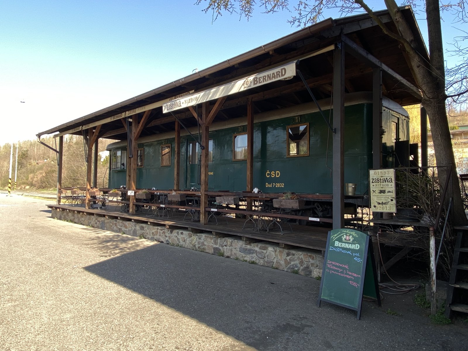 Stále svištíš po rovince kolem Berounky, název silnice se opět změní, tentokrát Na Břasích, posléze na Berounská až dojedeš k železničnímu přejezdu. Jeď rovně do nádražní hospůdky občerstvit se. Možná potkáš majitele architekta Tomáše Hanáka.